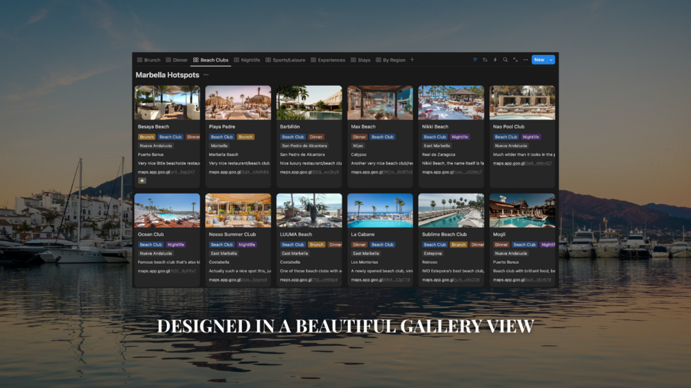 - Design-Airbnbs (50x): Wait - DESIGN Airbnbs? Yes, design-Airbnbs. We found that finding an actual beautiful Airbnb in a sought-after place like Marbella was quite a challenging task, so we asked our lovely designer to go through all the Airbnb's in the area and curate a list of the 50 best ones, ranging from very affordable to super luxurious.